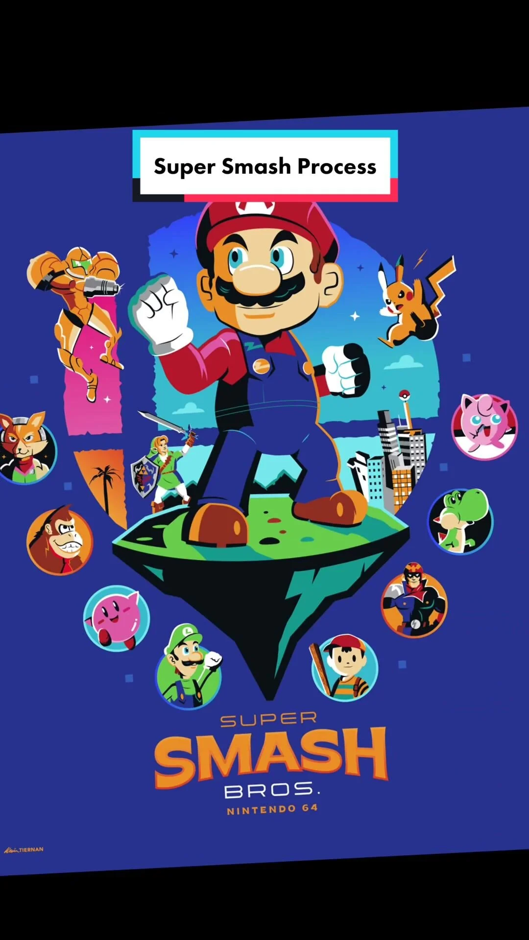 Super Smash Bros. ’64: instant good memories and nostalgia. This poster is for the 2023 ONESheet show at Gallery1988, a group exhibition dedicated to classic video games. I wanted to depict all of the characters in the game, with four players featured in the forefront. I chose a vibrant color palette to reflect the fun vibes of Super Smash Bros. gameplay.